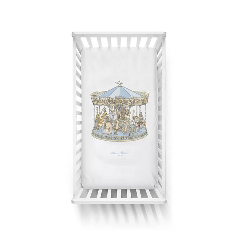 Atelier Choux Satin Fitted Sheet Carousel Blueis an elegantand functional daily essential; printed with water-based, baby-safe inks. These water-based inks are well integrated within our highly absorbent fabric and are lock-in during an air-drying process, therefore there is no concern that prints will significantly lighten or disappear over time.