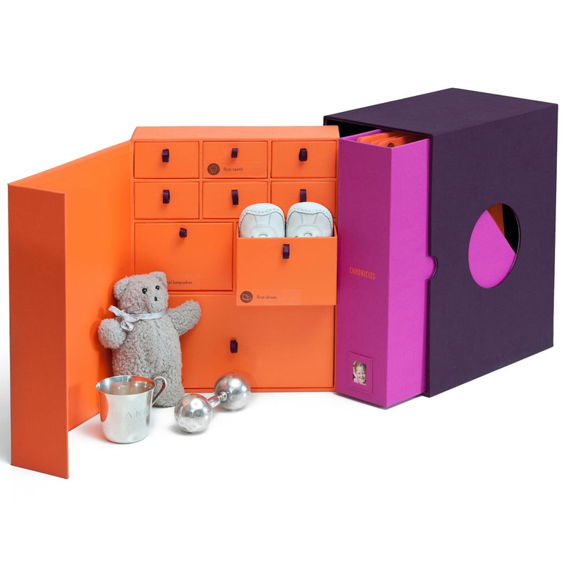 The sturdy, custom-dyed fabric boxes of The Library are meant to be displayed like beautiful books and passed on proudly to the next generation, more fitting than that old shoe box. While childhood may be fleeting, the memories last forever with The Library Starter Set.