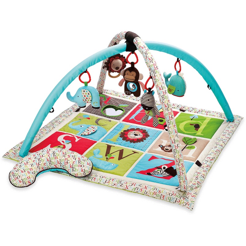 With a friendly family of wild animals, bright alphabet patterns and more to hear, see, feel and touch, this activity gym grows with baby! Attach the soft arches with loops for 5 animal friends to hang high, low or on the mat. Baby can gaze up at the colors, patterns and mirror, or reach and grab to discover textures and sounds. Tummy time with the quilted mat and matching pillow rewards baby with crinkles, a removable mirror, tactile fringes, flaps and more.