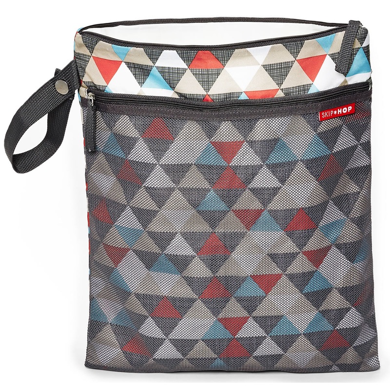 Two handy sections keep wet and dry clothes separated; or use one pocket to keep dirty diapers at bay. A handy strap makes it easy to attach to a stroller. Large zippered pocket for wet items or dirty diapers Mesh zippered pocket for dry, clean items Water
