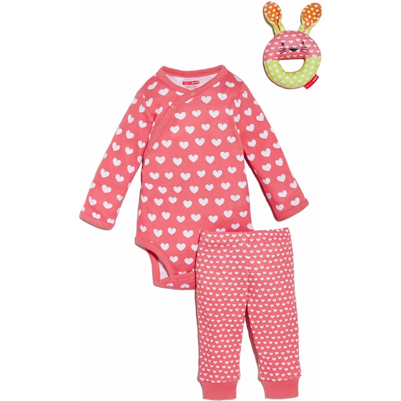 With bright colors and fun patterns, Skip Hop's POP Prints 3-piece layette set makes a truly standout baby gift. Featuring a long sleeve bodysuit, baby pants and a matching soft rattle tucked inside an organza bag, it's available in four fun hues: watermel