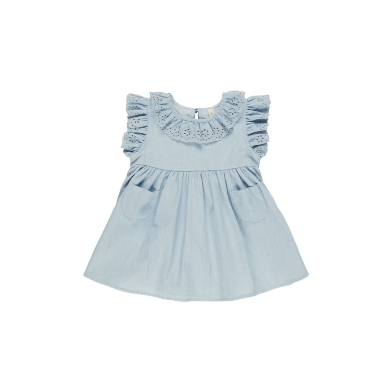 Our Sophie Dress features a beautiful collar and ruffle sleeves with eyelet detail, and cute front pockets.Featuring our chambray fabric. Welcome blue skies in this summery style.Care: Machine wash cold. Tumble dry low.Made of 100% organic cotton.