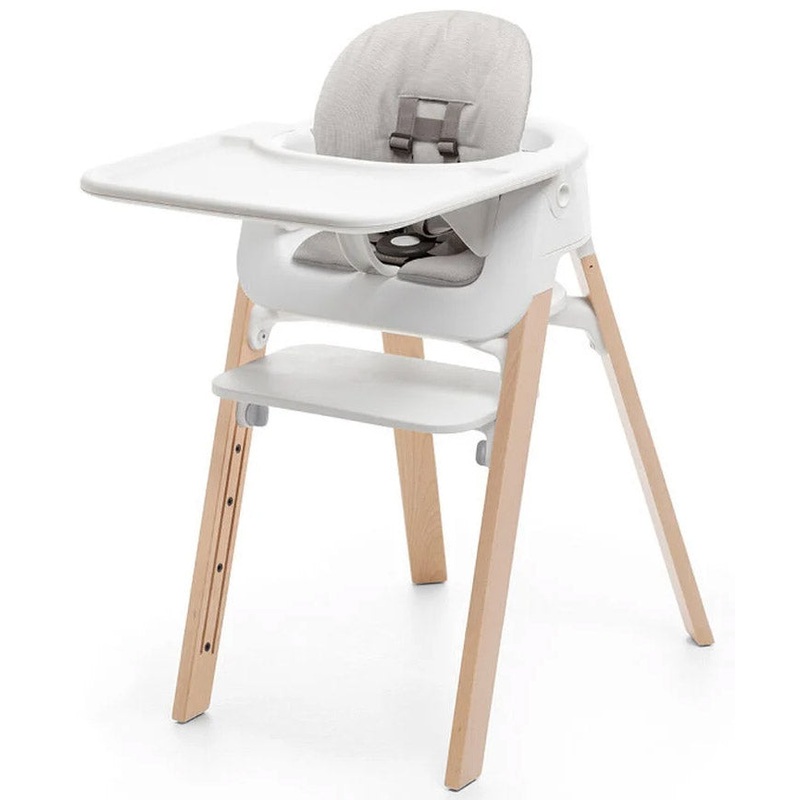 Optional accessories transform the Stokke Steps Chair into a seating solution that can be used from birth with the Bouncer, bringing your newborn to the table and with the Stokke Steps Baby Set to create the highchair.