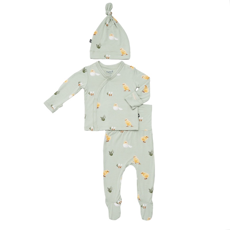Welcome your newborn with the perfect outfit to mark the occasion. This ultra-soft set features a kimono style top thats gentle and non-irritating on your babys umbilical cord stump, footed pants to cover those tiny toes, and a stretchy cap to keep their head warm.