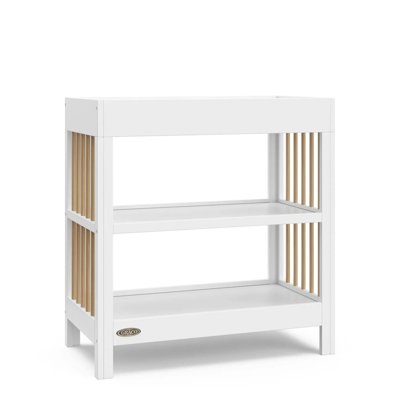 Combining modern style with convenient nursery storage, the Graco Teddi Changing Table features 2 open storage shelves to store your nursery and changing essentials and includes a bonus water-resistant baby changing pad with safety strap. The Teddi is crafted from quality pine wood, poplar dowels, wood composites, and its applied finish has been tested to meet or exceed the applicable ASTM and CPSIA safety standards. Also, like all Graco changing tables, the Teddi is JPMA Certified meaning its been expert tested to meet or exceed all applicable category voluntary and mandatory safety standards.