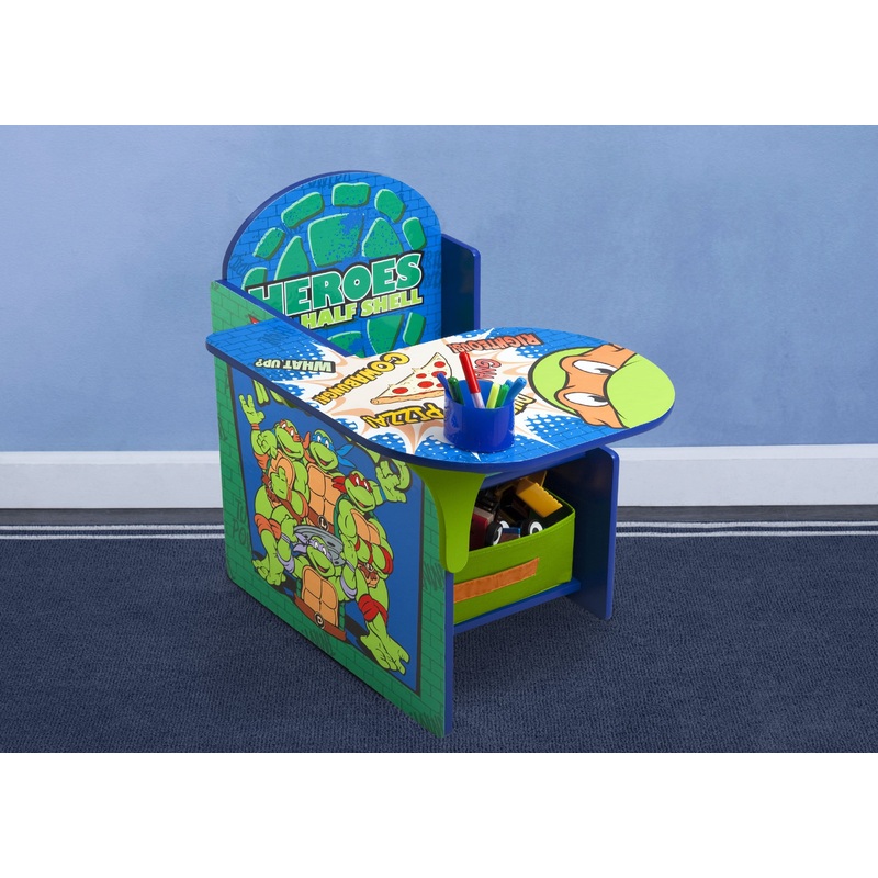 Whether toddlers are tackling snack time or school work, this Ninja Turtles Chair Desk with Storage Bin makes the grade! Boasting a colorful finish that showcases all the superpowers of the Ninja Turtles, it also features a built-in cup holder and a storage bin underneath that keeps art supplies, books or toys close at hand.