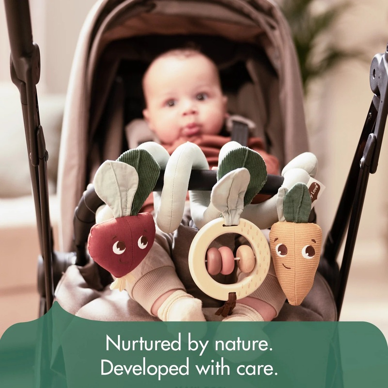 The Spiral Stroller Activity Toy offers fun, on-the-go sensory stimulation and entertainment, helping grow important skills along the way. The adorable beetroot and carrot duo of lovable veggie characters easily attaches to most strollers, capturing the im