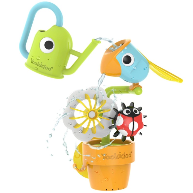 A garden themed bath toy- a flower pot with a tipping bird, spinning flower and ladybug. Also includes a watering can that can be used to water the bird at the top of the flower pot and set off a chain reaction of fun! Ages 18mo+Pour water into the bird, t