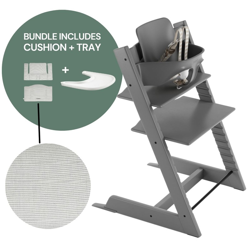 The Tripp Trapp? Chair is conveniently offered in a package that also provides a Tripp Trapp? Baby Set with harness and gliders, plus a Tripp Trapp? Classic Cushion and Tray. When used together, these items make a standalone high chair, which safely and er