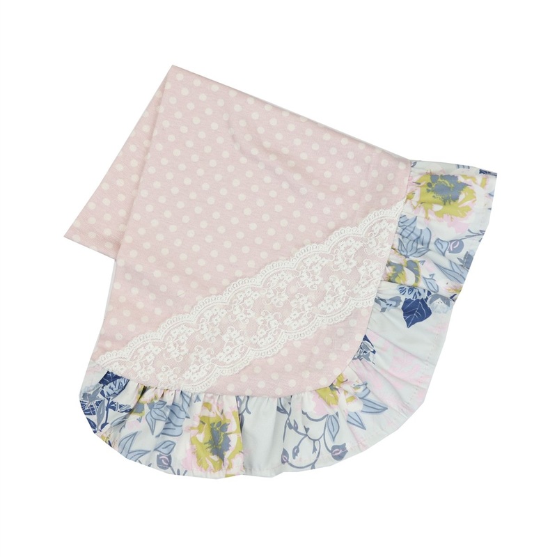 Twilight Blanket. Blanket size is 28X28 inches with 2 1/2″ ruffles around.“Wrap your little one in cozy comfort and delicate charm with our cotton and lace ruffle receiving blanket. Crafted from soft, breathable cotton, this blanket provides a gentle embrace for your baby, ensuring warmth and security during precious moments of rest and relaxation. The whimsical lace ruffles adorning the edges add a touch of timeless elegance, creating a lovely frame for your bundle of joy. Perfect for swaddling, cuddling, or as a stylish accessory for outings, this blanket is both practical and beautiful, making it an essential addition to any nursery or baby’s layette.”