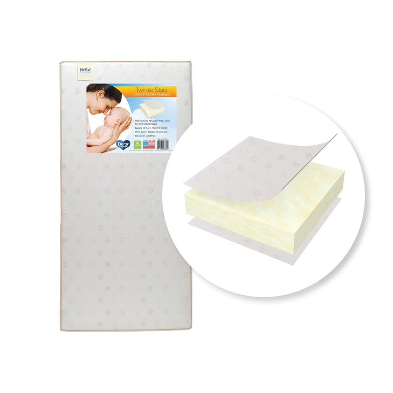 Delta Childrens Twinkle Stars Crib & Toddler Mattress offers your baby or toddler support and comfort at a great price. Built with a firm polyester fiber core, this sturdy mattress is has a durable waterproof cover for easy cleanup. Finished with square co
